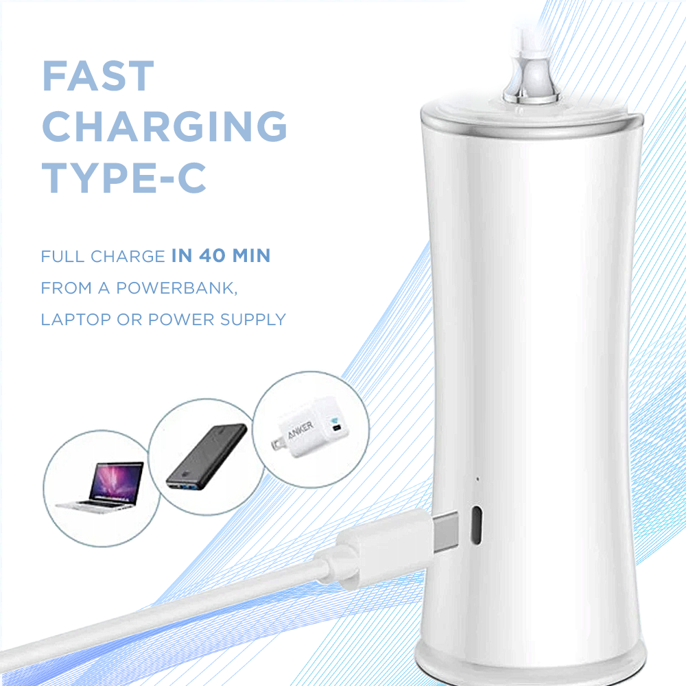 Grâce à la charge rapide via câble USB Type-C, l’appareil peut être rechargé depuis une prise secteur, un powerbank ou un ordinateur portable. La batterie intégrée permet une utilisation continue jusqu’à 60 minutes.